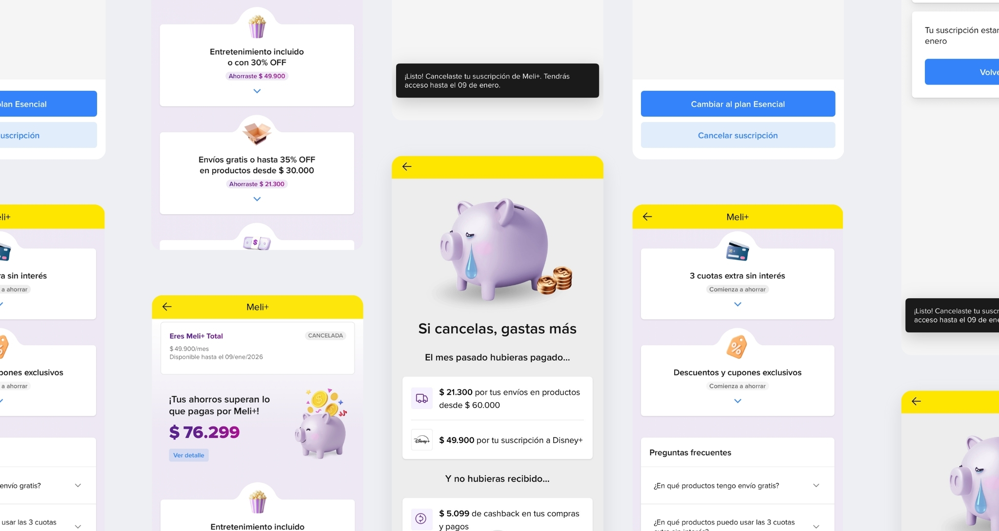 I led the content strategy and UX writing for the cancellation flow redesign, working closely with Product, Design, and Data teams to define the messaging framework for personalized savings, translate user behavior data into clear and scannable content, design copy that informed decisions without blocking cancellation, and ensure consistency with Meli+ tone, accessibility, and UX principles.